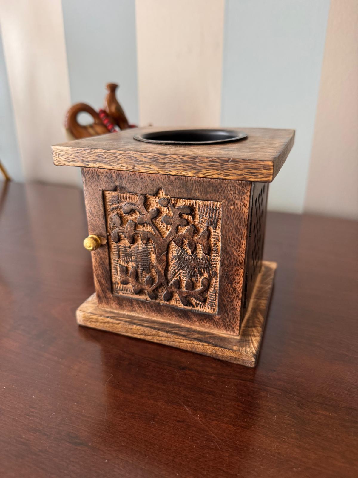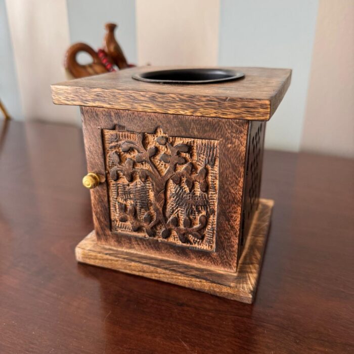Šis degiklis, pasižymintis gražiu rankomis raižytu Gyvybės medžio dizainu, pagamintas iš tvarios mango medienos, pasižymintis patvarumu ir simbolika.