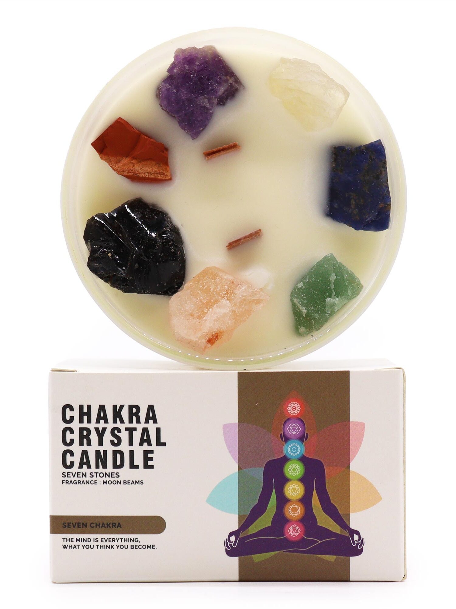 Harmonizuokite ir subalansuokite visas savo čakras su mūsų septynių čakrų krištoline žvake. Pagaminta iš septynių akmenų, vaizduojančių kiekvieną čakrą, ši žvakė skleidžia „mėnulio spindulių“ kvapą.