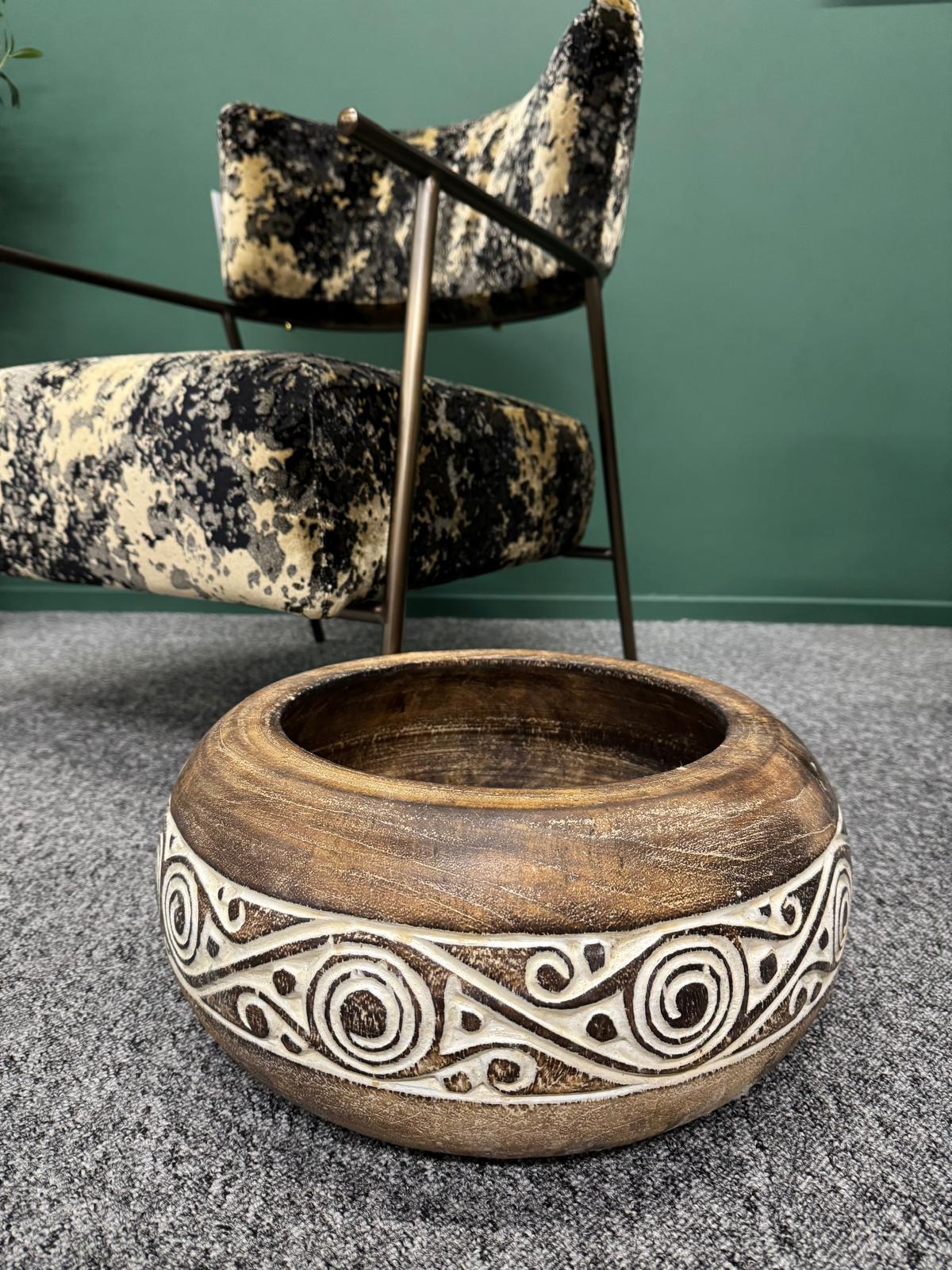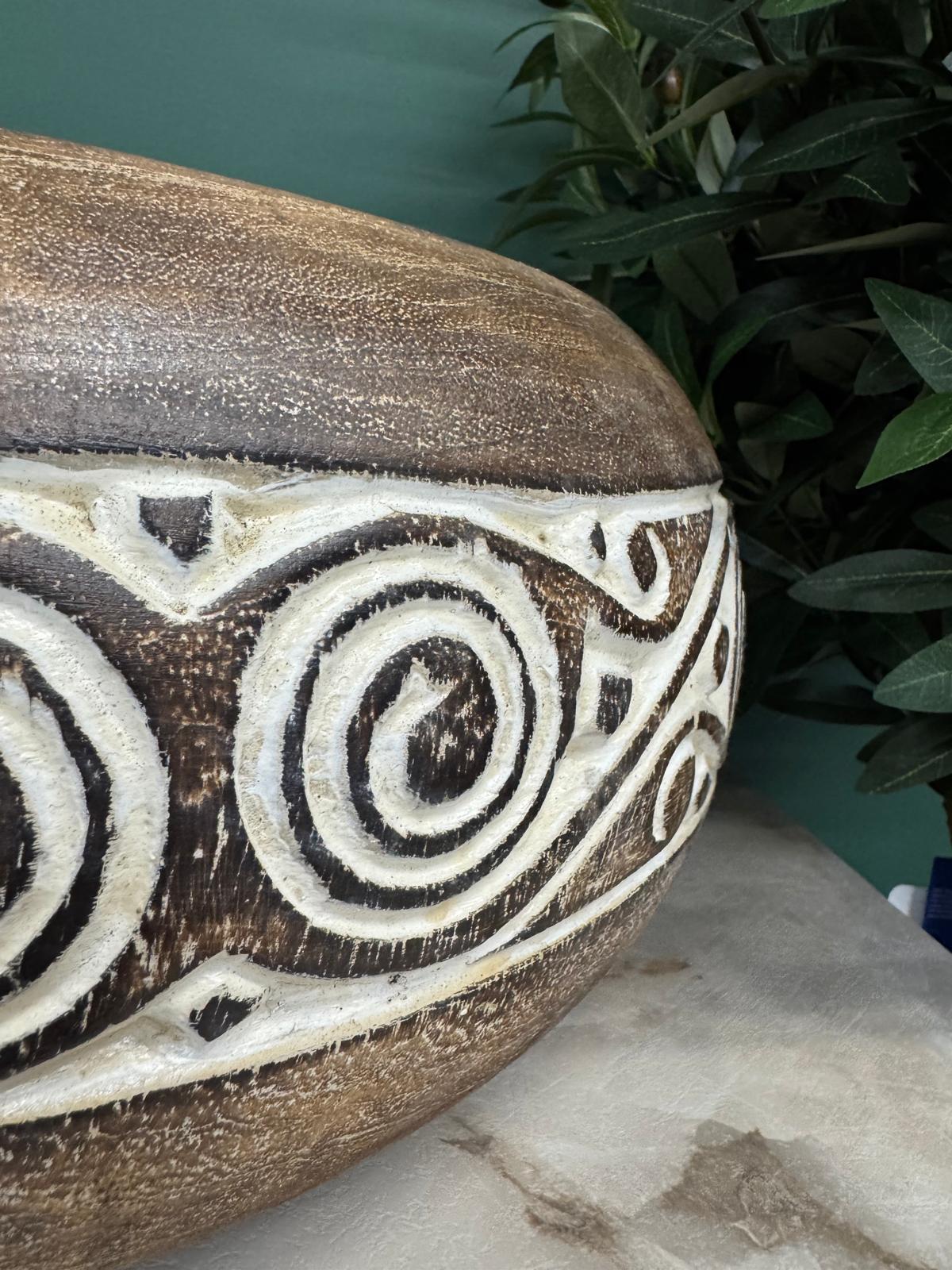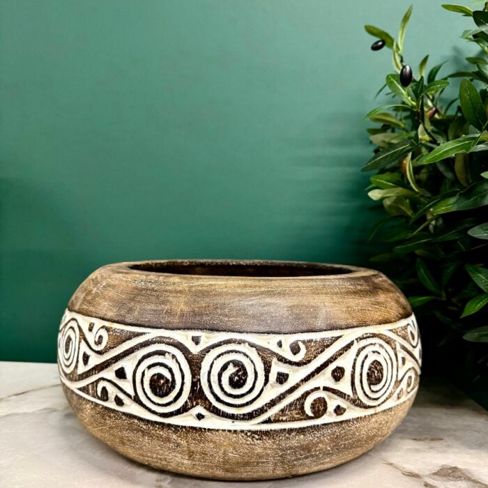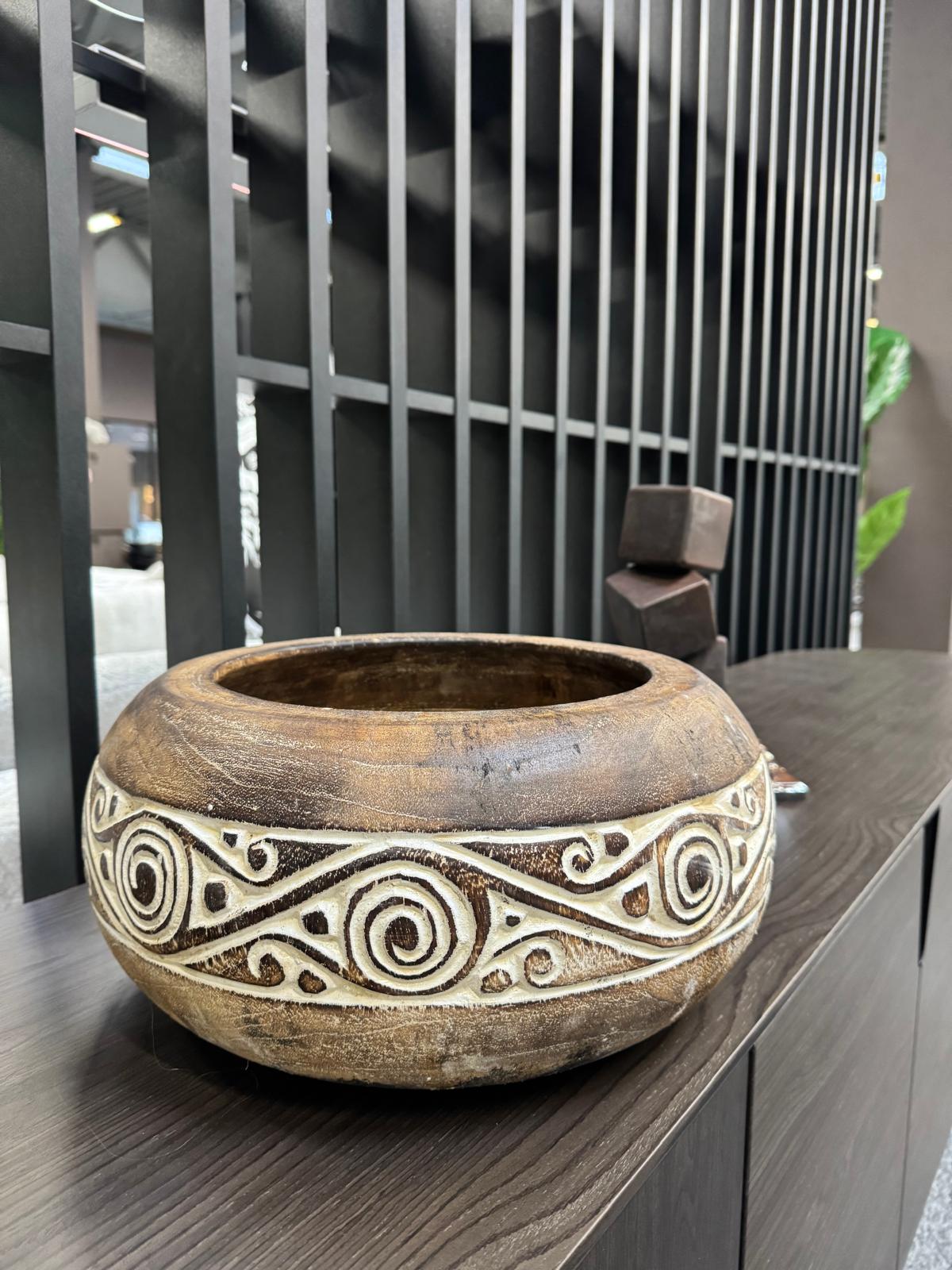 Atraskite išskirtinį dekoratyvinį dubenį, kruopščiai pagamintą Balio meistrų iš patvaraus Tiko medžio. Kiekvienas dubuo yra unikalus rankų darbo kūrinys, sendintas, kad perteiktų autentišką senovinį stilių bei subtilų meną iš praeities.
