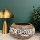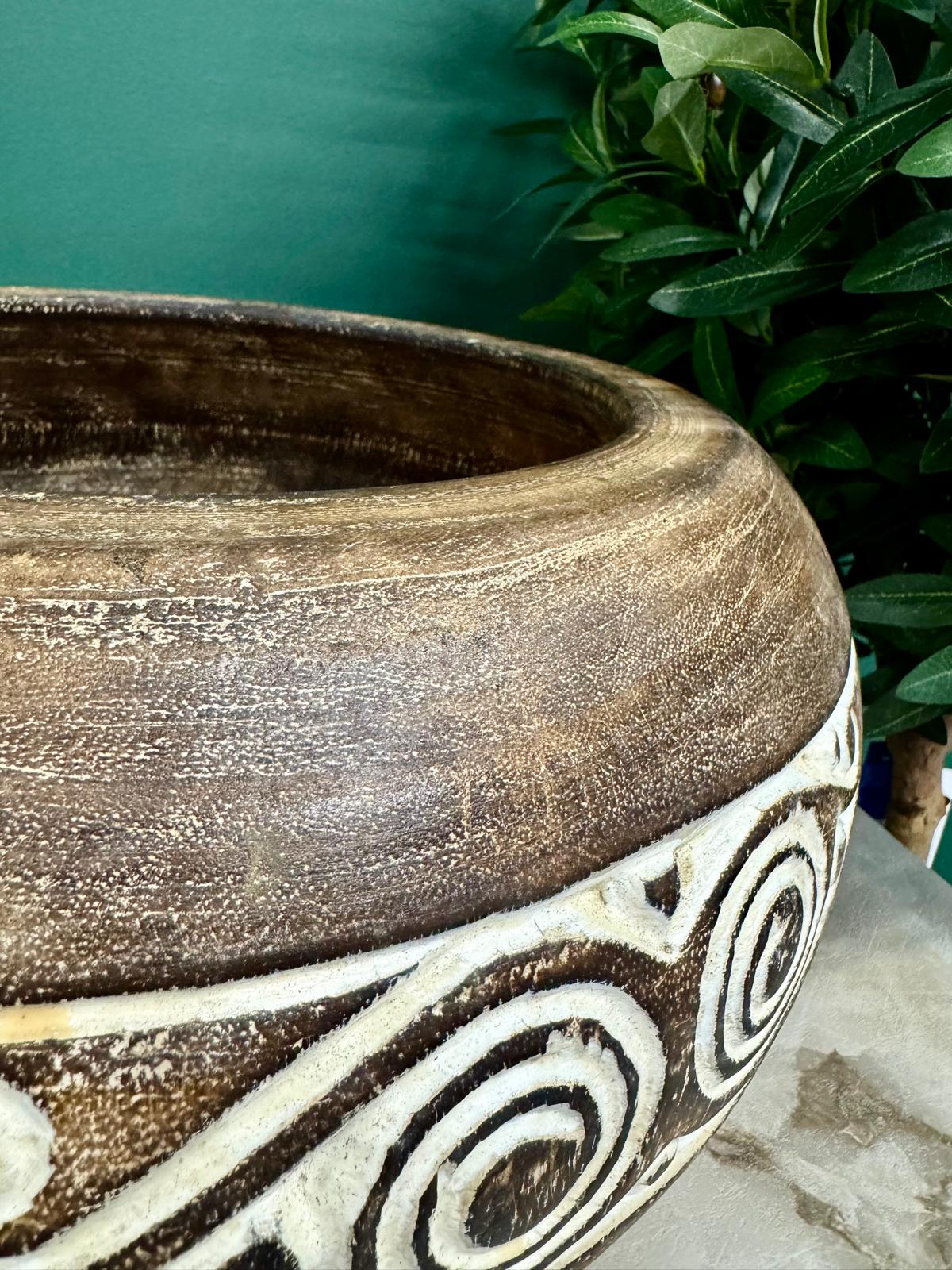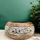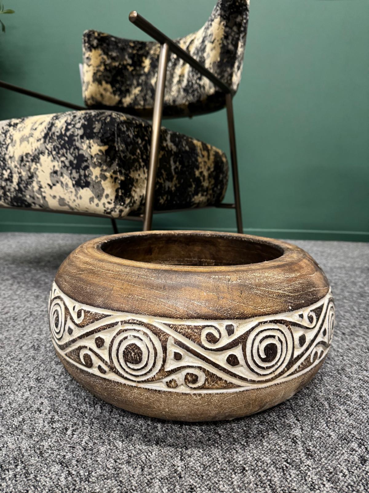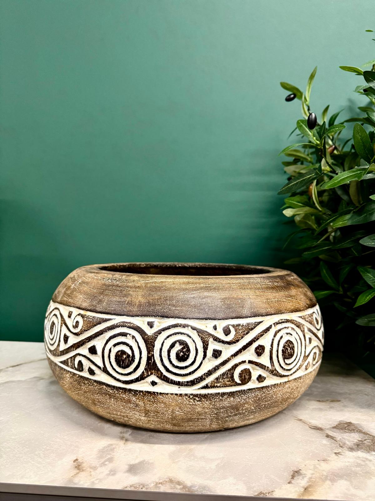 Atraskite išskirtinį dekoratyvinį dubenį, kruopščiai pagamintą Balio meistrų iš patvaraus Tiko medžio. Kiekvienas dubuo yra unikalus rankų darbo kūrinys, sendintas, kad perteiktų autentišką senovinį stilių bei subtilų meną iš praeities.