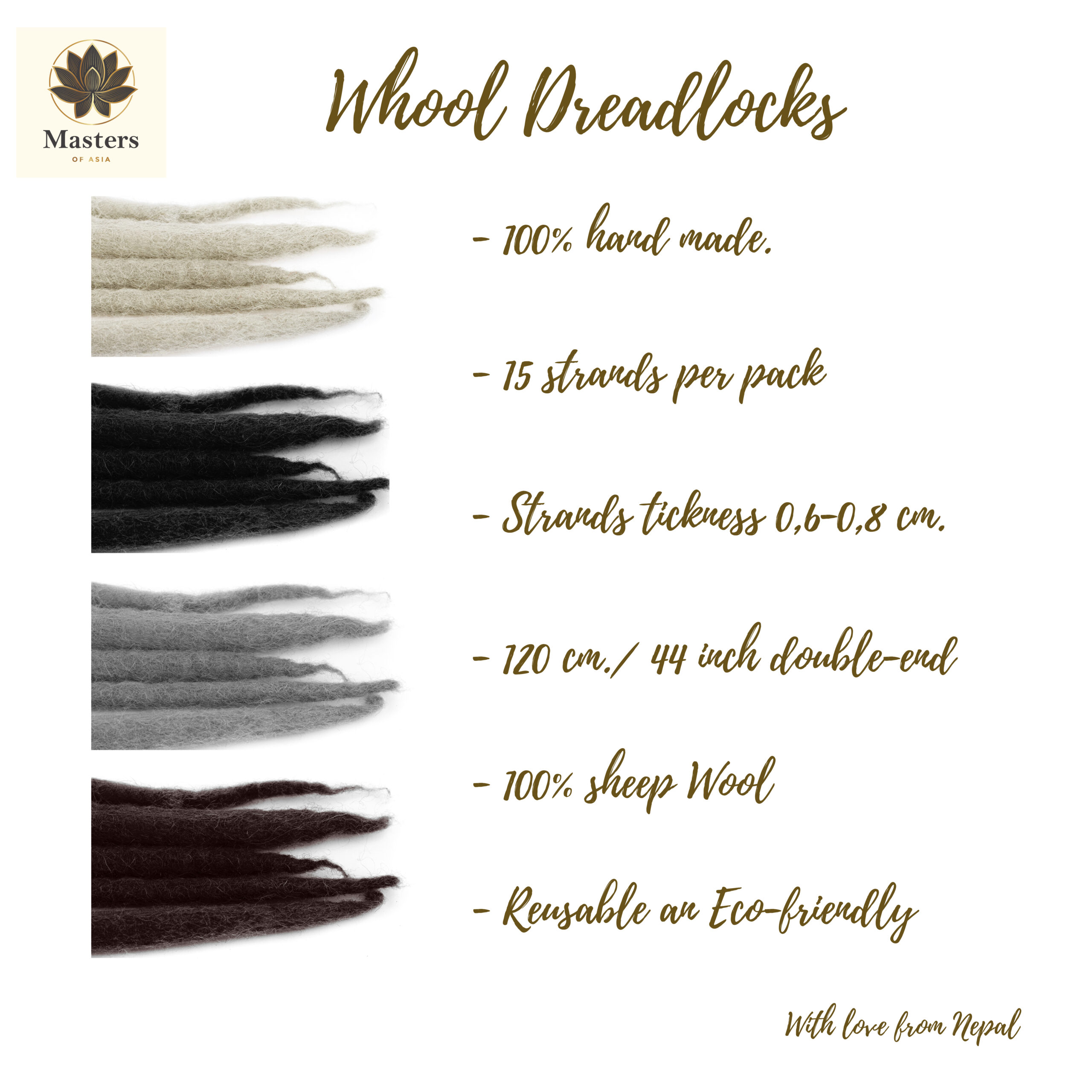 Natūralūs rankų darbo dredai iš 100% avies vilnos, 120cm ilgio, 15 vnt. pakelyje.