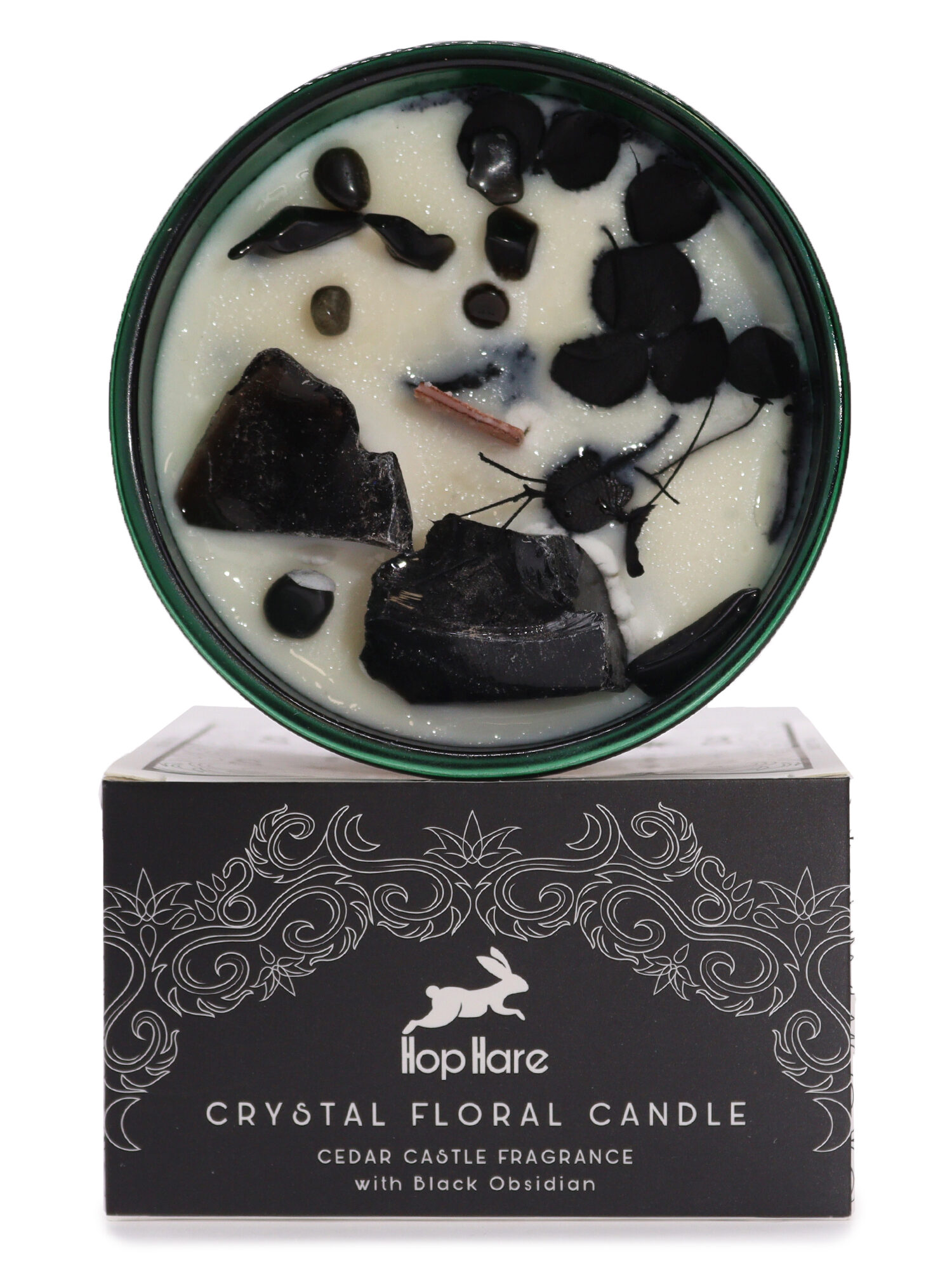 Kiekviena „Hop Hare“ krištolinė magiška žvakė, įdėta į tamsiai žalią stiklinį indą su kaimiška medine dagtimi, yra unikalus šedevras. Atskleiskite savyje slypinčią magiją, atrasdami brangakmenį, lydimą smulkesnių brangakmenių drožlių, sukurdami akinančią gamtos stebuklų ekspoziciją. Šių žvakių esmę dar labiau sustiprina subtilūs sausi žiedai.