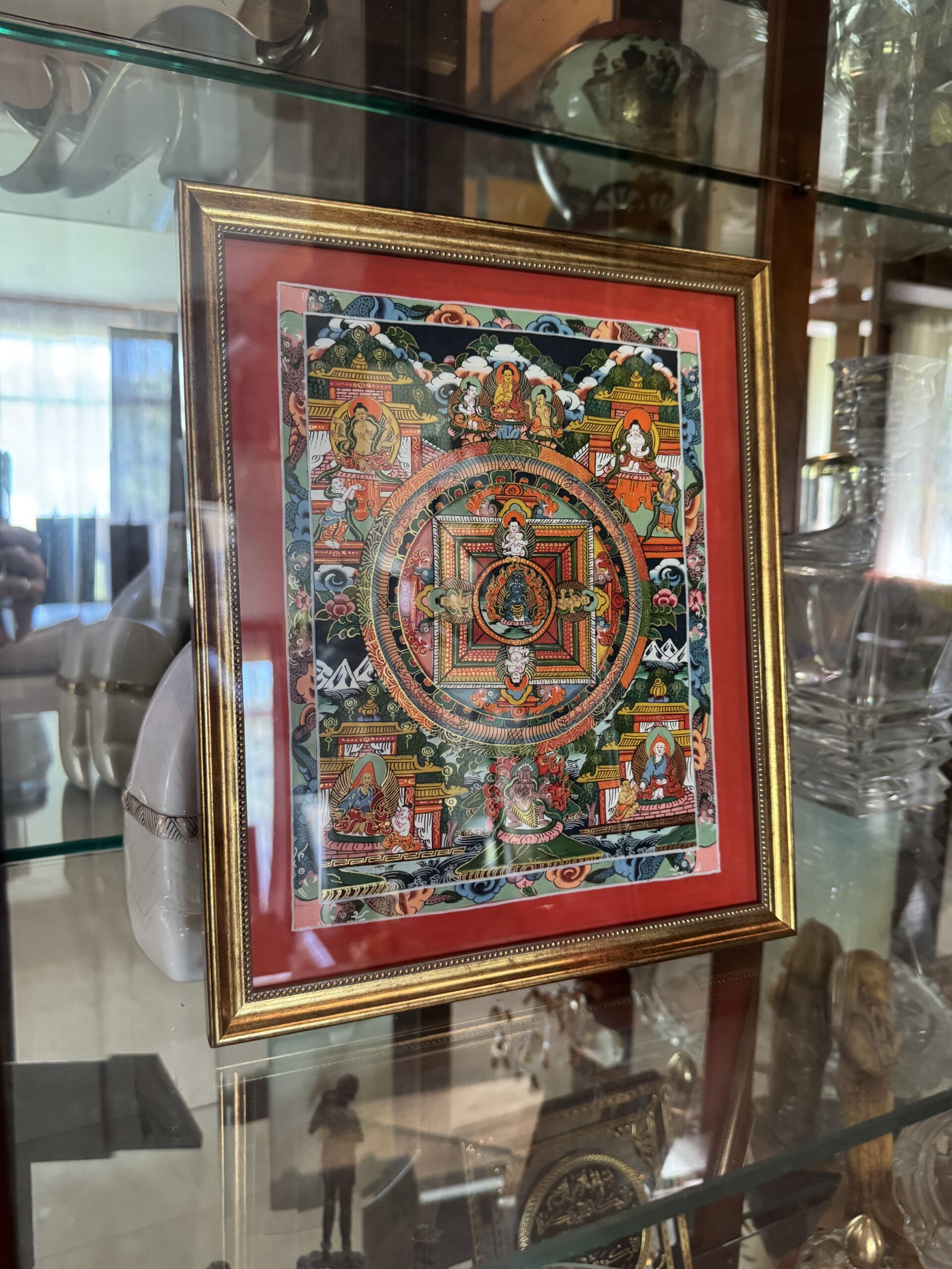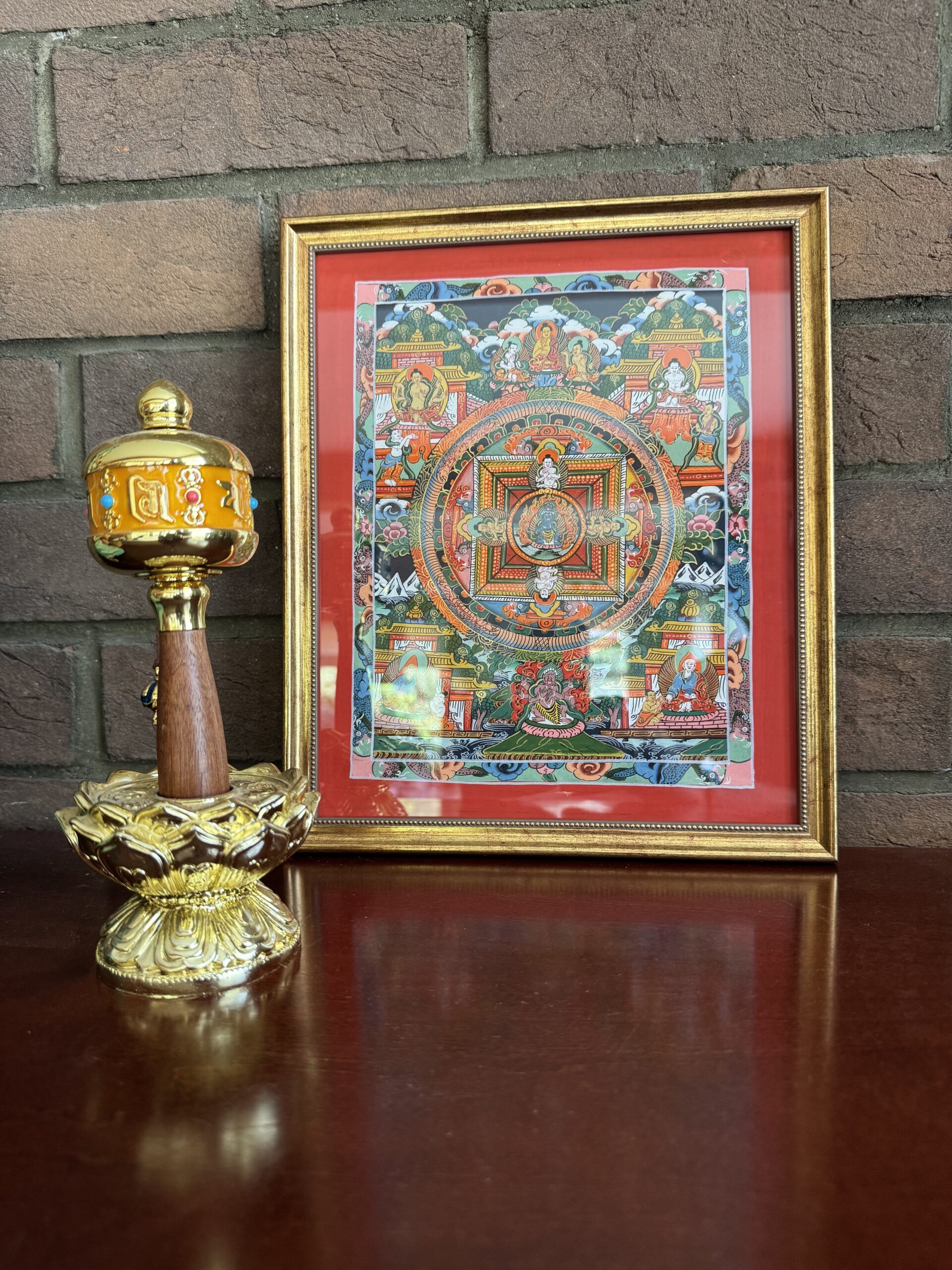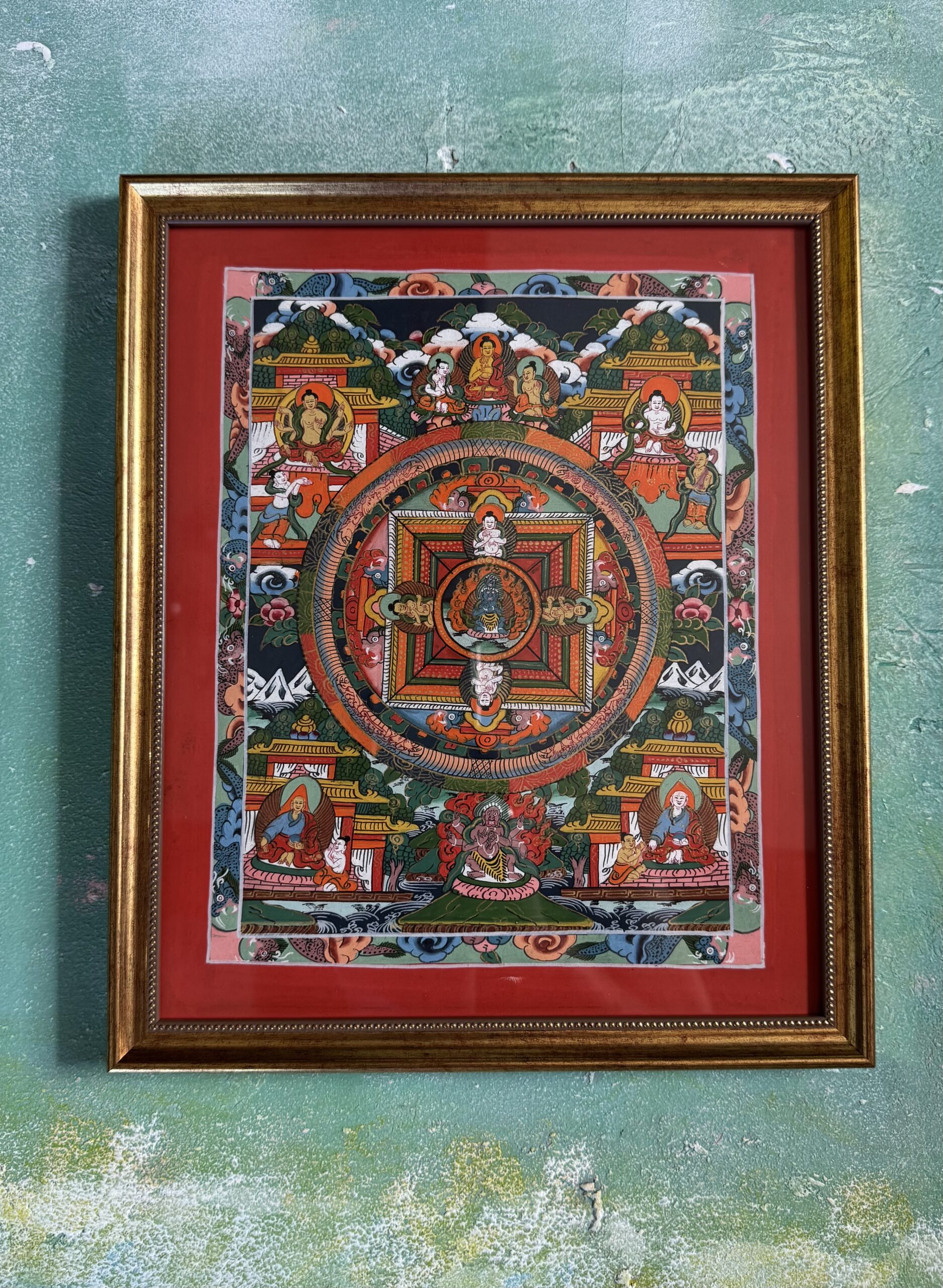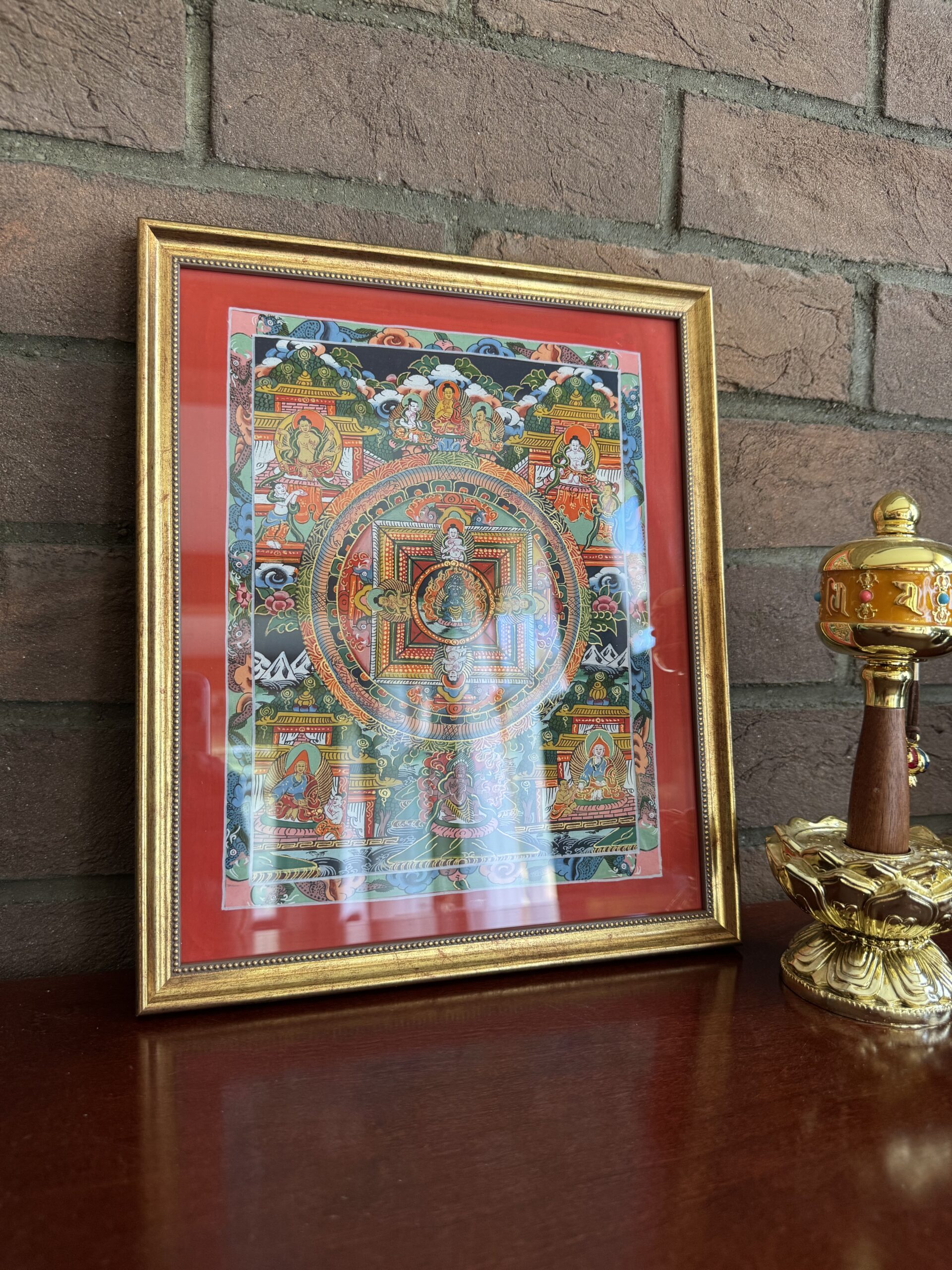 Centrinėje mandaloje vaizduojama meditacinė dievybė, apsupta geometrinės visatos struktūros – keturios kryptys, vartai, šventi simboliai ir apsaugantys mokytojai. Tai tarsi vizualus dvasinis žemėlapis, vedantis į vidinį centrą.