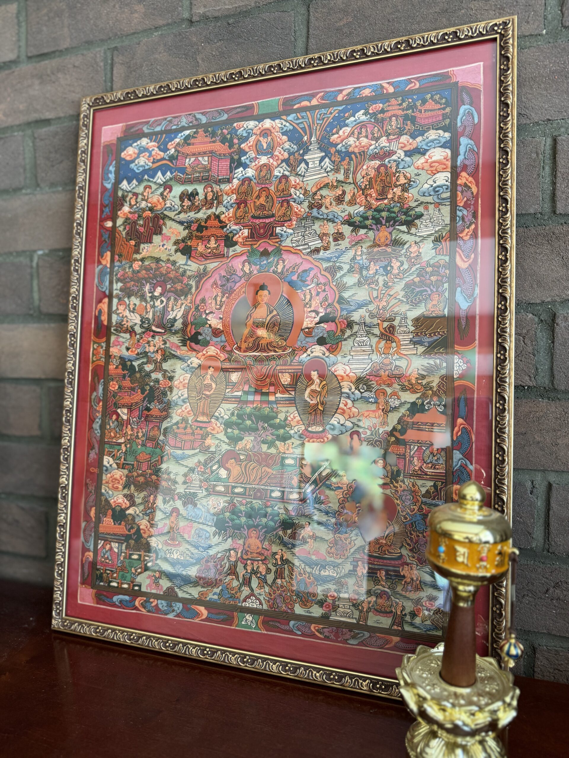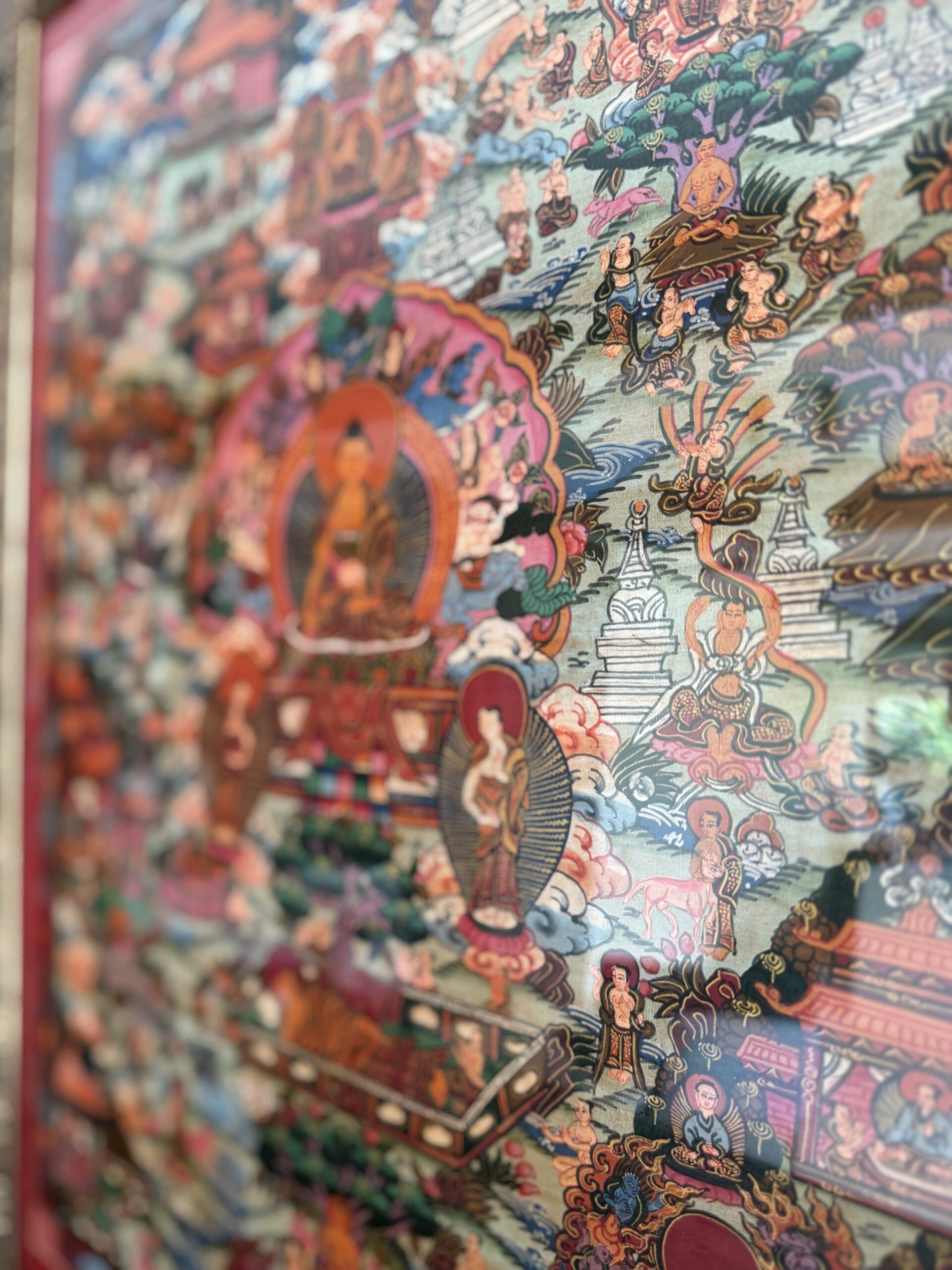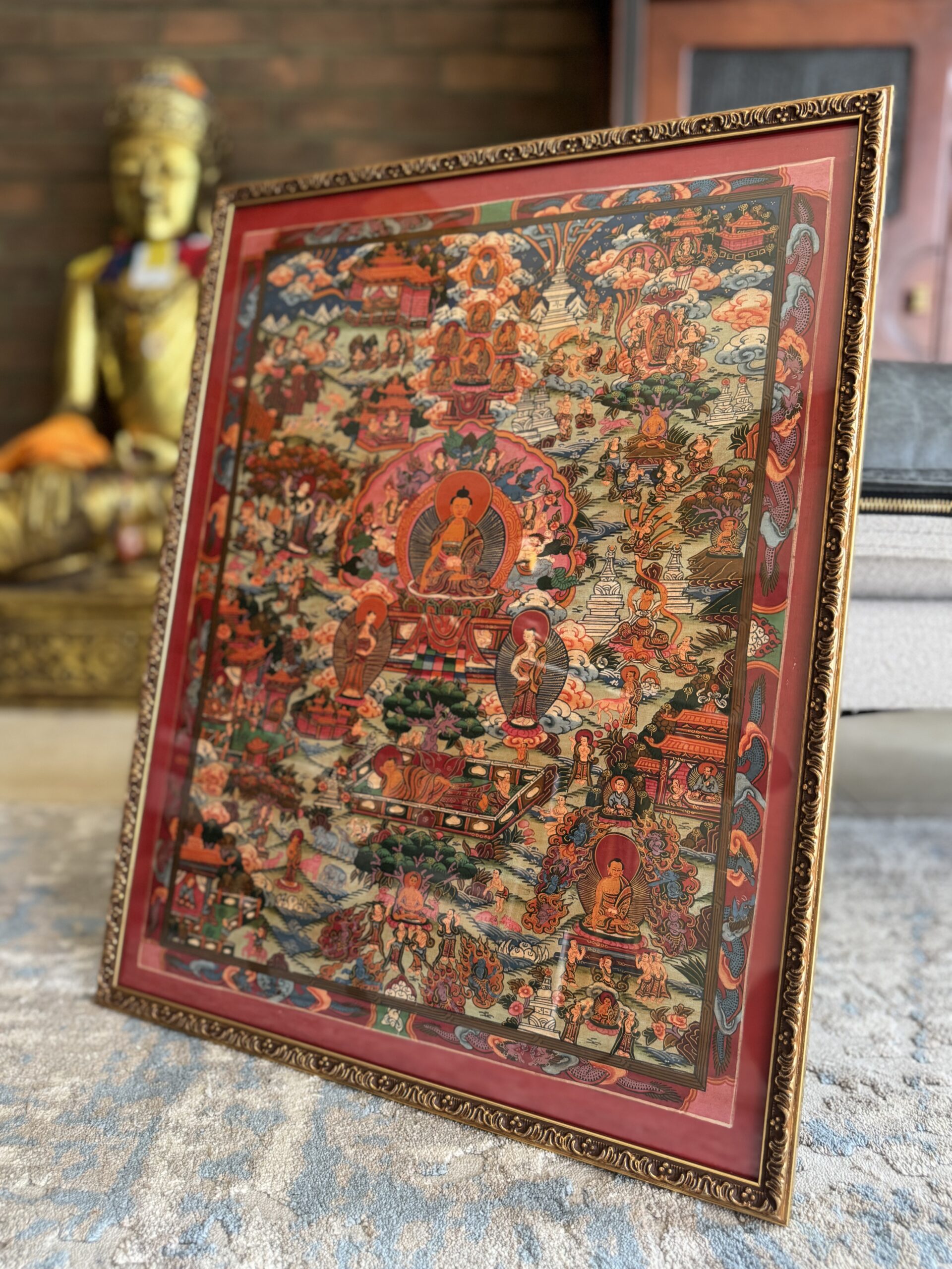Ši autentiška rankų darbo tanka iš Nepalo vaizduoja Budos kelią – dvasinę kelionę nuo pasaulietiško gyvenimo iki nušvitimo, kai žmogus tampa pabudusiu, išsilaisvinusiu iš kančios rato. Tai vizualinis dvasinio virsmo žemėlapis, pasakojantis apie ieškojimą, vidinę kovą, tiesos pažinimą ir gailestingumą visoms būtybėms.