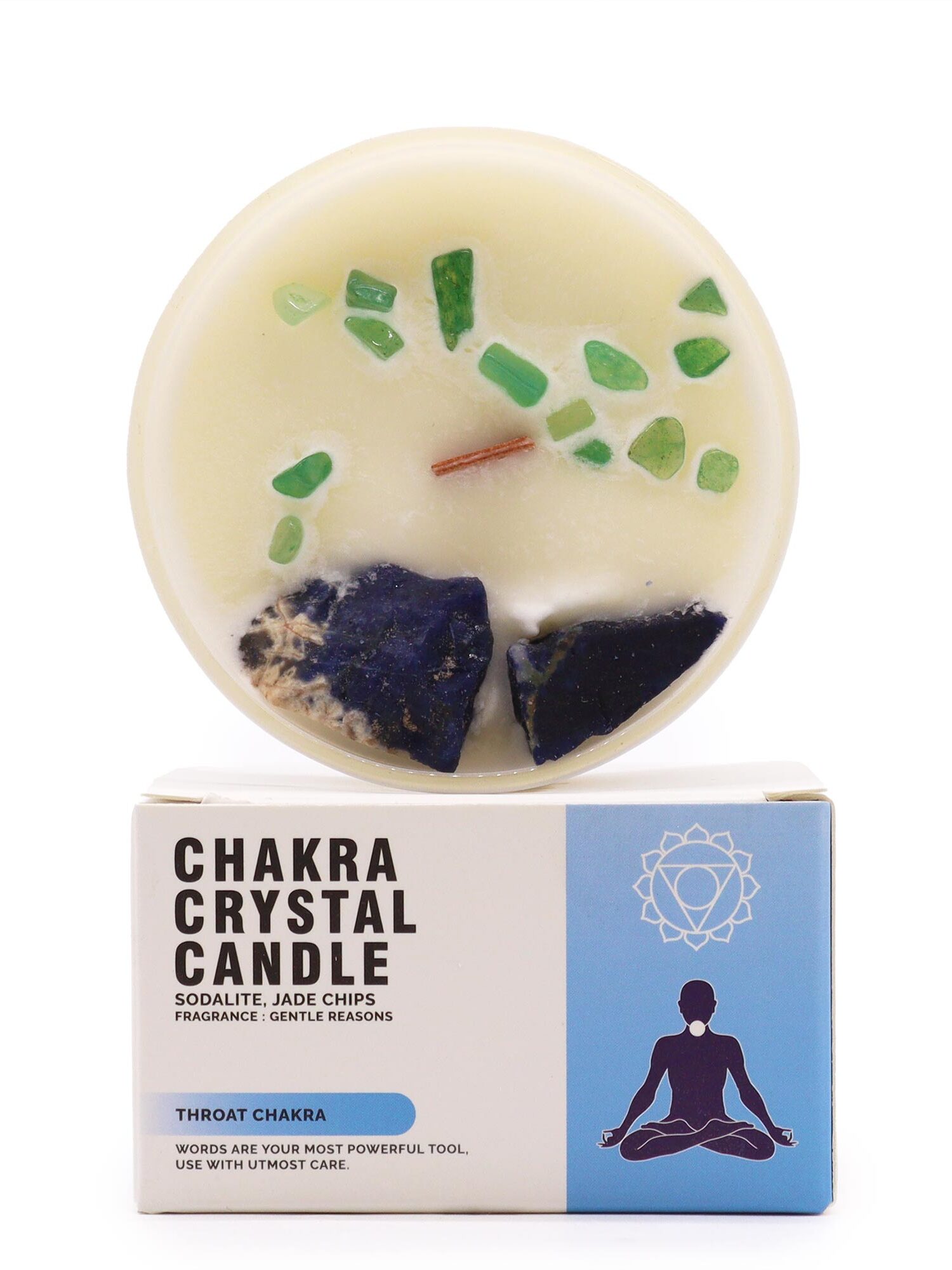 Atraskite savo balsą ir pagerinkite bendravimą su mūsų gerklės čakrų krištolo žvake. Pagaminta iš sodalito ir nefrito drožlių, ši žvakė rezonuoja su gerklės čakros esme.